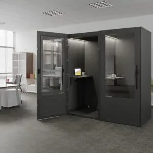 En telefonboks er typisk en kompakt boks til én person, som bruges til opkald, videomøder og korte arbejdsopgaver. En mødeboks er større og bruges af to eller flere personer til mindre møder og samtaler. Begge løsninger er udviklet til at skabe mere ro, privatliv og bedre akustik i kontormiljøer.