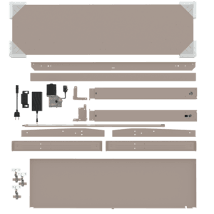 Bordpladen er todelt, den forreste bordplade er hængslet, og under bordpladen gemmer sig en opbevaringshylde med plads til en bærbar computer og papirer. Hyldens bredde giver masser af opbevaring, og dybden på hylden er afstemt, så der stadigvæk er masser af benplads, når man sidder ved skrivebordet. Hylden er lavet i pulverlakeret stål, så overfladen er behagelig at røre ved, og den har en træfront i samme farve som bordpladen.