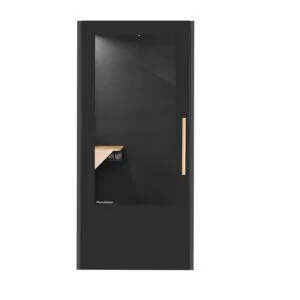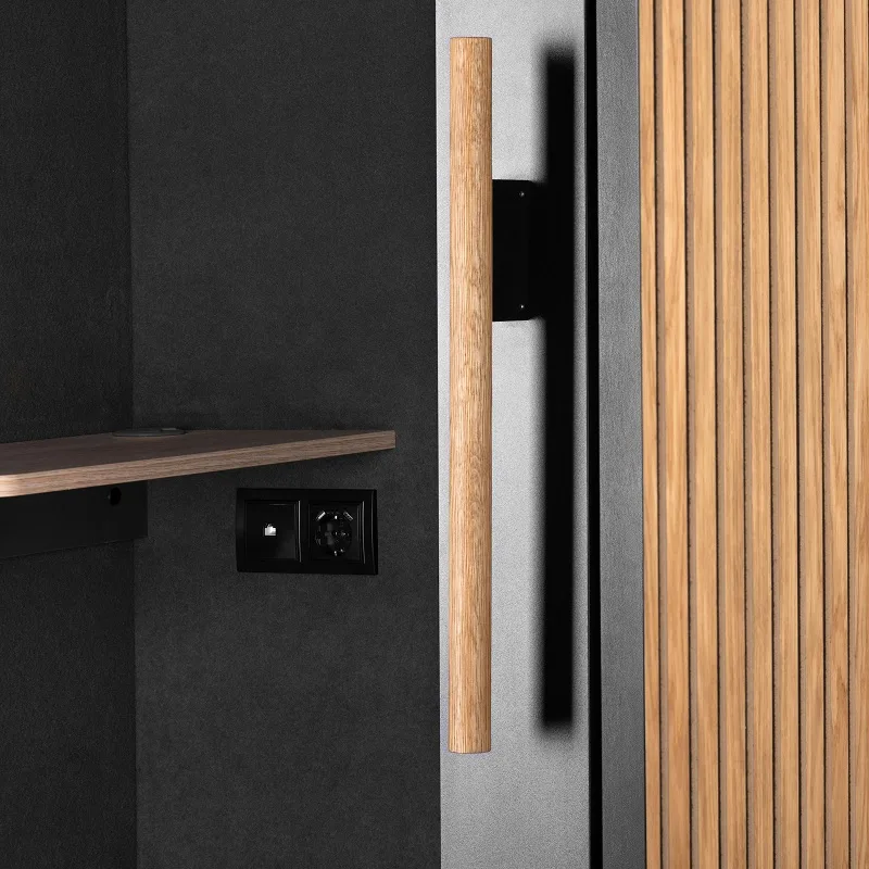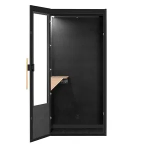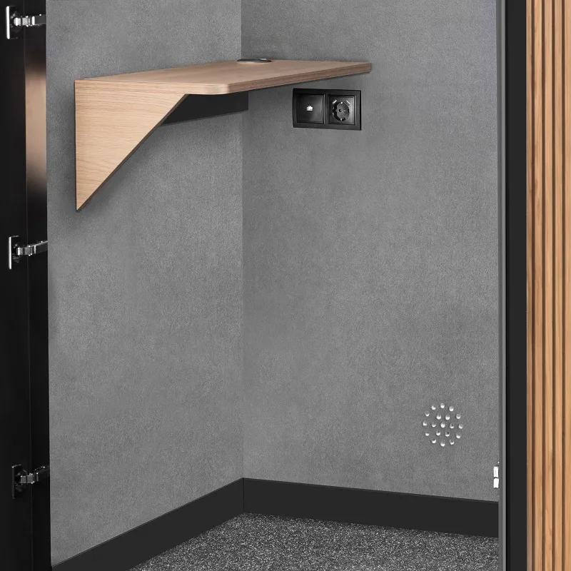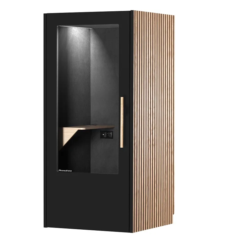 Telefonboksen leveres med et moderne udtryk med egetræslammeler på siderne. Boksen kommer som standart med strømudtag, LED lys, USB stik og en lydsvag ventilation, der aktiveres af en bevægelsescensor når der er bevægelse i boksen. Telefonboksen kan vælges i flere farver og dørens glas er lamineret sikkerhedsglas, som er hængslet med magnetisk soft-close.